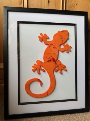 Framed original acrylic pour on acrylic in red, orange and gold.