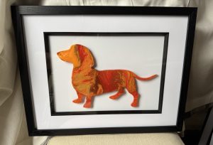 Framed original acrylic pour on acrylic in yellow, red, orange and green.